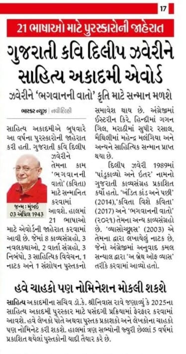 ‘કાવ્યવિશ્વ’ તરફથી કવિ દિલીપ ઝવેરીને સાહિત્ય અકાદેમી એવોર્ડ મળ્યો એ નિમિત્તે અઢળક અભિનંદન.