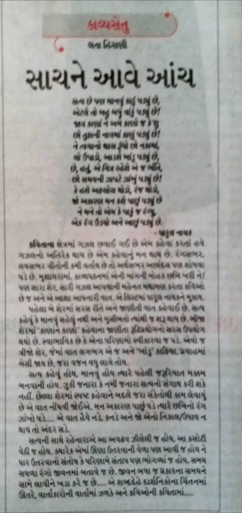આજના દિવ્ય ભાસ્કરની મધુરિમા પૂર્તિમાં’કાવ્યસેતુ’ અંતર્ગત સુ. શ્રી લતાબેન હિરાણીએ મારી ગઝલનો સુંદર આસ્વાદ કરાવ્યો છે અને આશાસ્પદ ગઝલ લેખનમાં મારું કશુંક પ્રદાન છે એવો ઉલ્લેખ કર્યો છે એ મારે માટે અત્યંત પ્રેરણાદાયક છે, ખૂબ ખૂબ આભાર માનું છું.