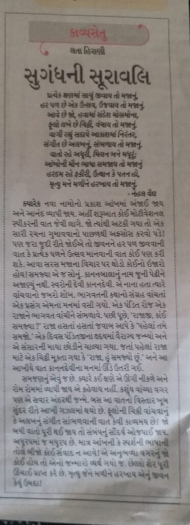 કાવ્યસેતુ 438. નેહલ વૈદ્ય – સુગંધની સૂરાવલિ 30.5.23