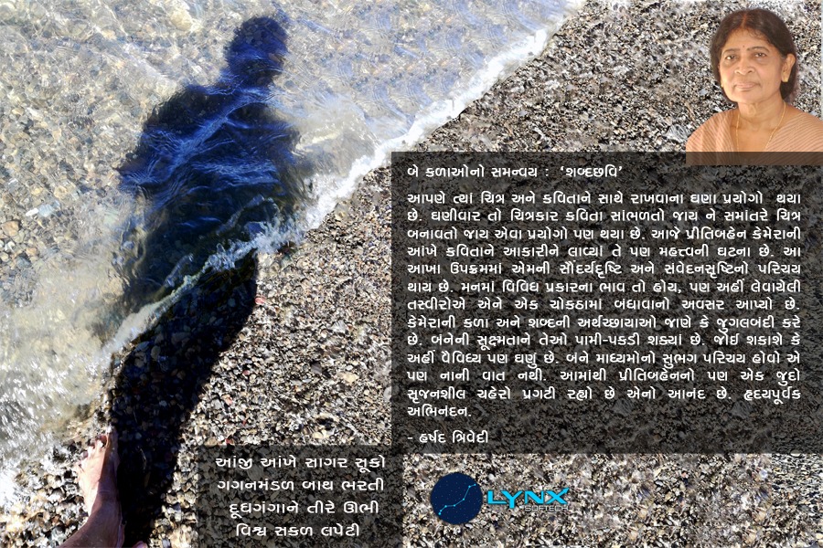 અચાનક એક સરસ પુસ્તક ભેટમાં આવ્યું. હાથમાં લેતાં જ ફોટોગ્રાફ્સ જોઈ દિલ ખુશ થઈ ગયું અને એના સર્જક સાથે સંવાદ સાધ્યો. પ્રીતિબહેન વ્યવસાયે વેબસાઈટ ડેવલપર છે અને ફોટોગ્રાફી તથા સાહિત્યમાં ઘણો રસ ધરાવે છે. દરેક પાને ખૂબ સુંદર ફોટોગ્રાફ્સ અને એમાં મૂકેલા શબ્દોમાં એક કવિનું હૃદય ધબકતું હતું.