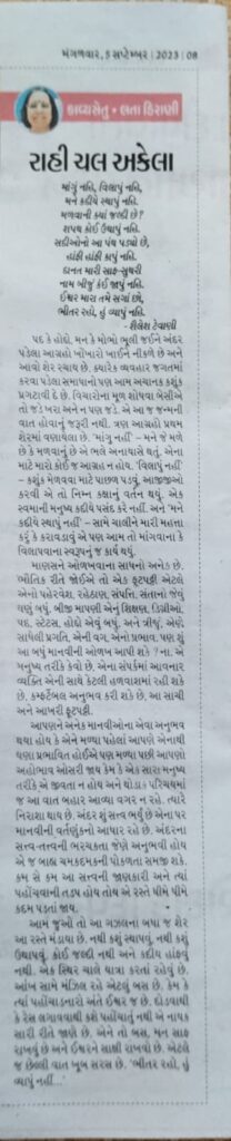 રાહી ચલ અકેલા ~ દિવ્ય ભાસ્કર > કાવ્યસેતુ 452 > 5.9.2023