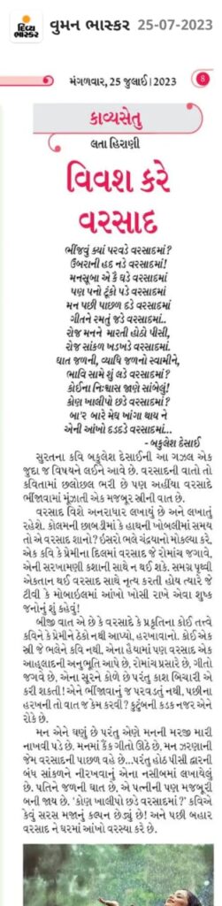 કાવ્યસેતુ > દિવ્ય ભાસ્કર > 25.7.23 > વિવશ કરે વરસાદ ~ લતા હિરાણી