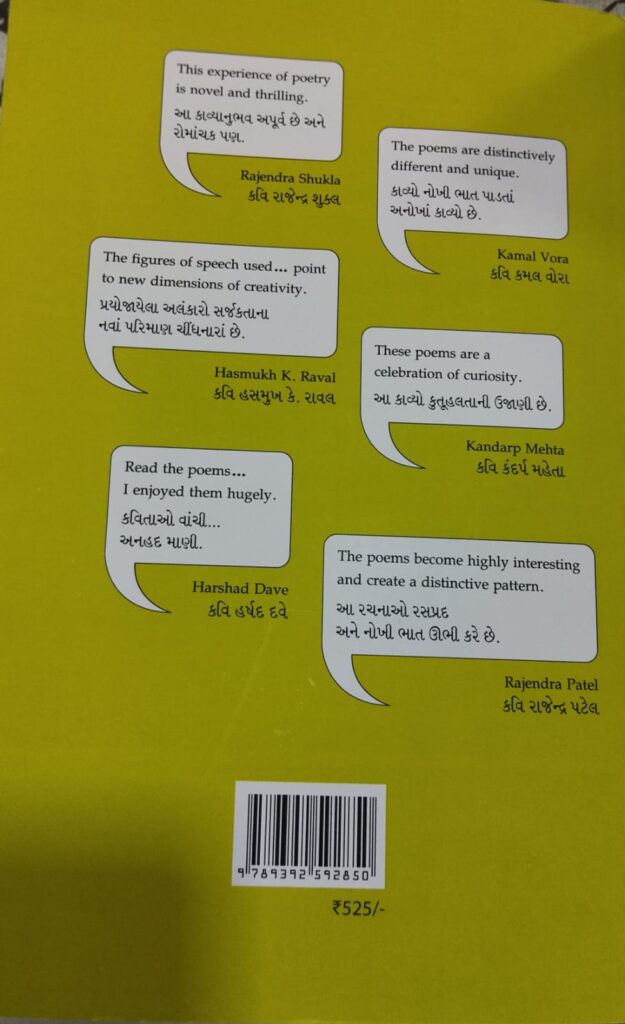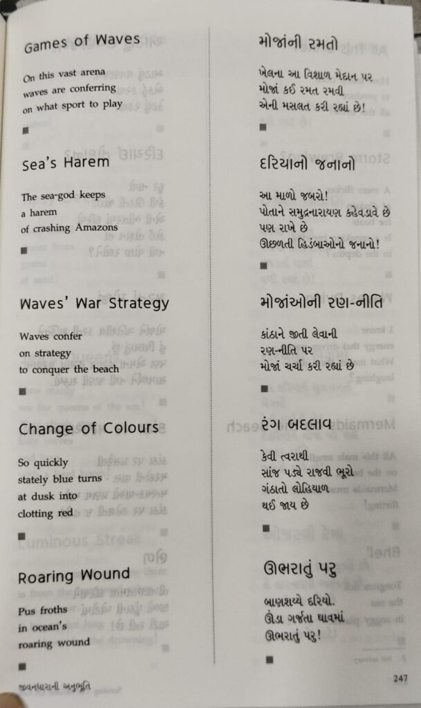 એક લઘુકાવ્ય – ‘આટલું લવણજળ / એકઠું કરવા / કેટલાં રડ્યાં ?’ – દરિયા જેટલી ખારાશ ભરવા માટે સમગ્ર સંસારની પીડાએ ઝંપલાવવું પડે ! ….. લાઘવ અને અર્થપૂર્ણતાનો સરસ સમન્વય.
